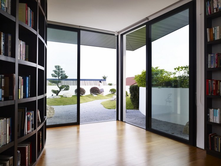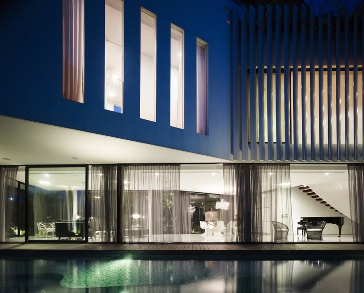 別墅設計,13 Cove Grove別墅(13 Cove Grove)13 Cove Grove別墅建在一處狹長的基地上,正對著一小片水域。為了使居住者最大化地欣賞到水域的風景,設計團隊將別墅裝修設計成一個類似回力鏢的體量,從而使臥室正面像這片美景。這樣的布局安排,使這個游泳池的一邊一直延伸至一層的一側。另外,團隊還在一層的主要區域設計了一個連續性的空間,進入這里后,人們可以看到筆直的水域獲得更加連續的視野。與水域相連的是一個線性的木質甲板設計,一直從房間內部延伸出來,視覺上增加了房屋的面積。除了基本的回力鏢設計,團隊至少還采用了另外兩種布局的變體,從立面設計看,設計師以完全不同的方式設計了不同兩側的回力鏢體量。面向街角的一層,將透明與封閉設計交叉使用,而二層則完全使用了實體墻進行立面設計。靠向水域的一層則采用了相對開放的透明玻璃設計,增強了可視度。一層主要作為公共活動空間,二層為臥室區域,而與屋頂花園相連接的三層則主要作為工作室使用。