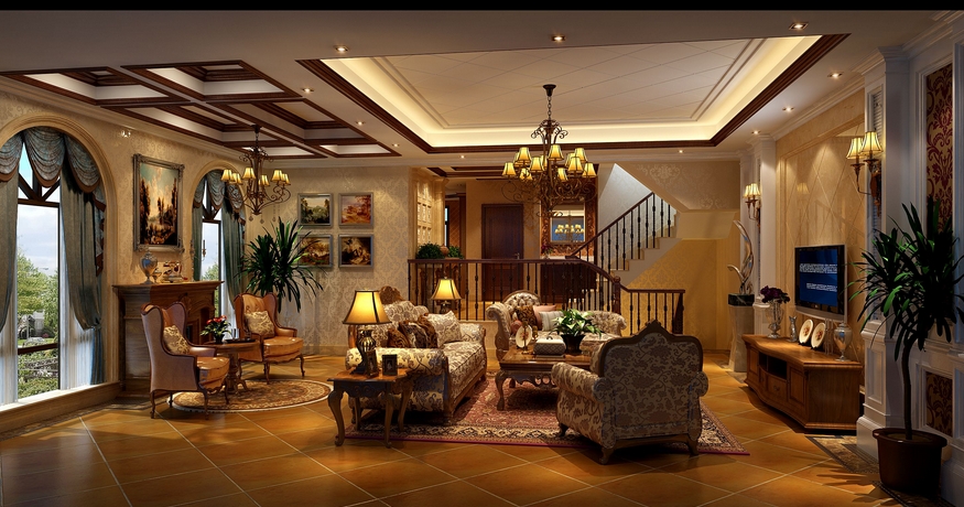 躍層、別墅等戶型的客廳挑空過高,設(shè)計師應(yīng)該解決視覺的舒適感受,具體做法是,采用體積大、樣式隆重的燈具彌補(bǔ)高處空曠的感覺。分隔線:在合適的位置圈出石膏線,或者用窗簾將客廳垂直分成兩層,令空間敞闊豪華而不空曠。